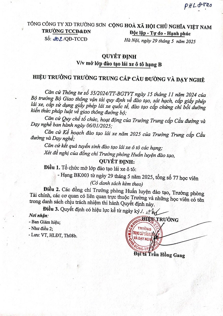 Quyết định Khai giảng khóa 3 Đào tạo lái xe B tại trung tâm